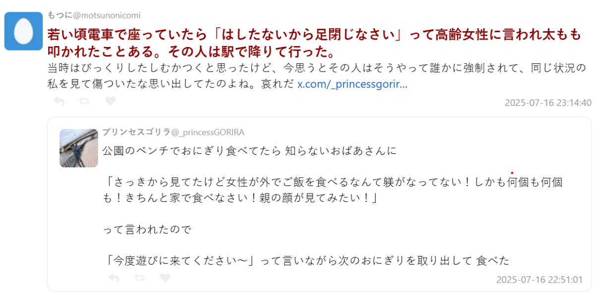 近日一則日本 X 上的推文在社群上爆紅,內容是一位女性推主分享自己在公園吃飯時遇到的荒謬插曲。她在公園的長椅上吃飯糰時,遭一名陌生阿嬤斥責「女性怎麼可以在外面吃飯,沒家教!」,讓她感到莫名其妙,也因為這樣世代價值觀差異引發網友熱議與共鳴。