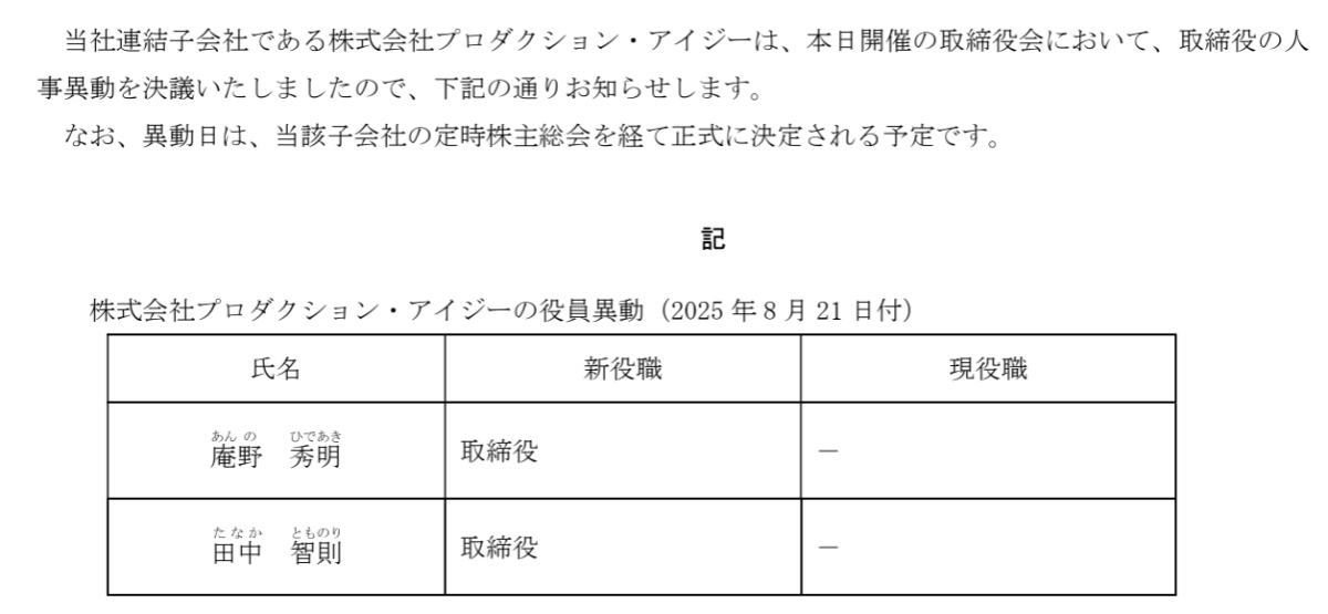 除了庵野之外,IG Port 同步宣布,田中智則也將一同擔任 Production I.G 的董事。他目前同時擔任「avex 通訊放送」旗下智慧生活事業部的影音服務部長,及「イーストグループホールディングス(East Group Holdings)」的董事職務。