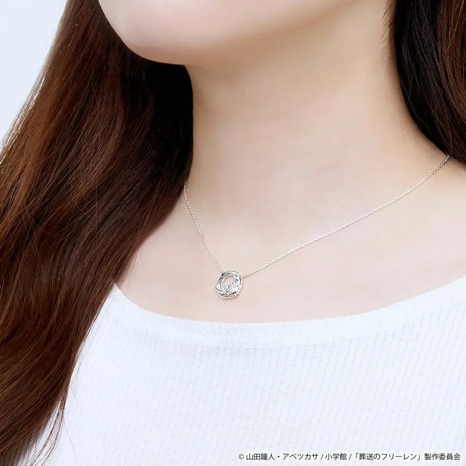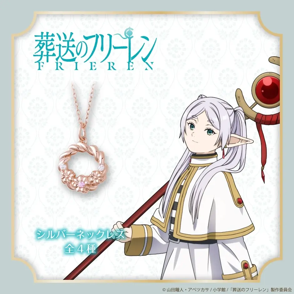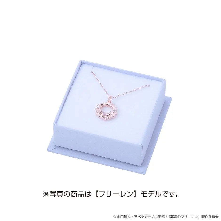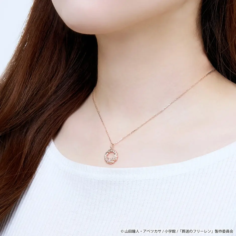 以芙莉蓮為靈感設計,項鍊設計融入了芙莉蓮從欣梅爾收到的花冠意象,鑲有粉紅與白色的寶石,並以玫瑰金色電鍍點綴,整體展現可愛又優雅的氛圍。