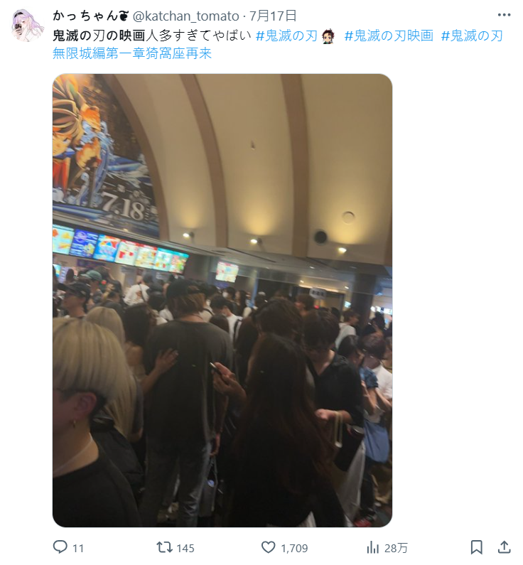 首日從最早的午夜場開始,幾乎日本各大戲院都塞爆到一票難求的程度,幾乎在日本可說是現象級的觀影運動。根據日本 X 上的票房觀察帳號ベーダーの興行収入速報 ( @mtt_75058 ) 公布,《鬼滅之刃劇場版 無限城篇》第一章首日票房就突破 17 億日圓,成為史上首日票房的紀錄。