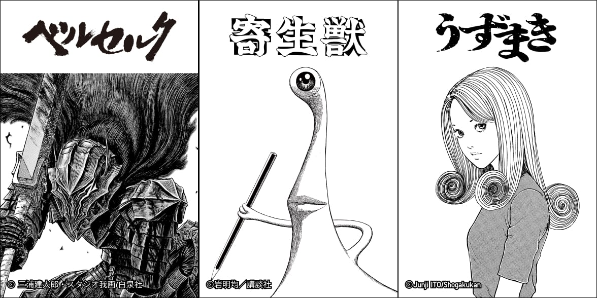 系列包含三部作品 : 三浦建太郎《烙印勇士》、岩明均《寄生獸》與伊藤潤二《漩渦》,都是非常具有特色的作品,非常符合本次聯名的黑暗風格,先前推出也相當受到好評。