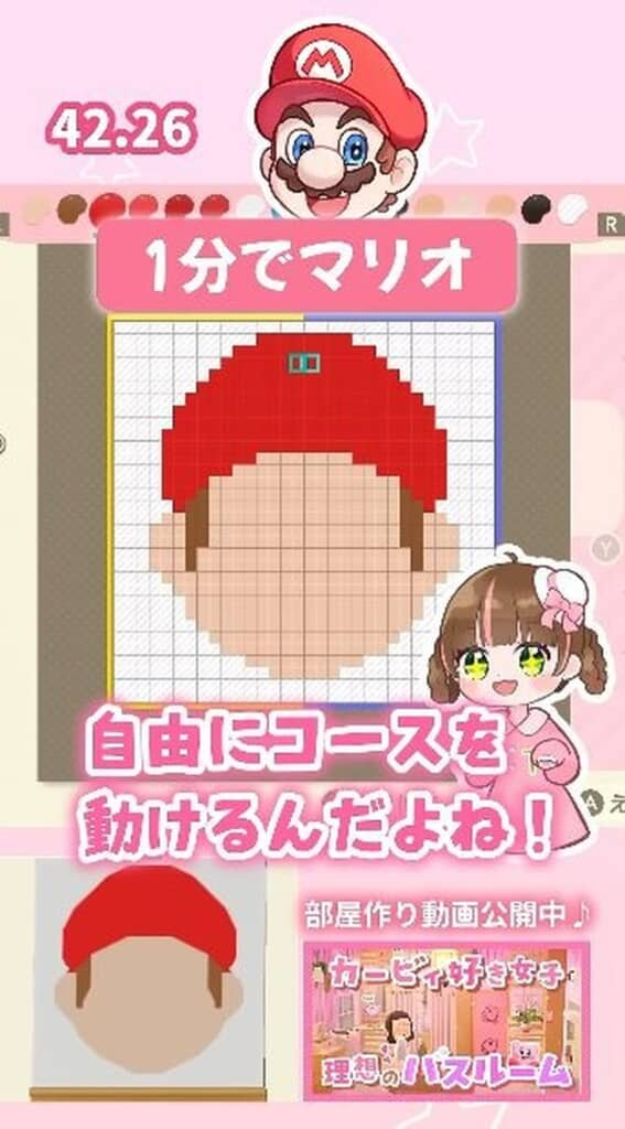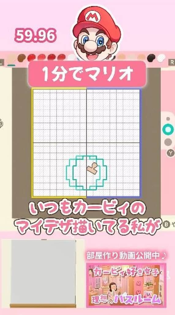 這次她挑戰用 1 分鐘在用《動物森友會》我的設計中畫出瑪利歐!但同時也小小哀怨地表示:自己抽選 Switch 2 主機失敗……於是就邊懷著期待與悔恨,一邊開始畫起點陣圖的瑪利歐。