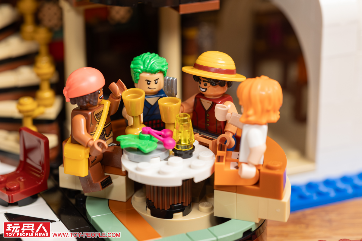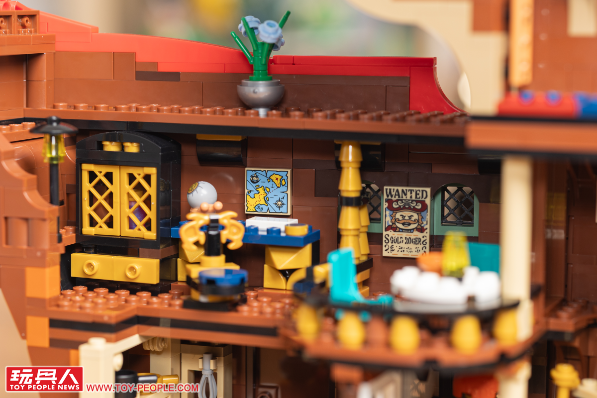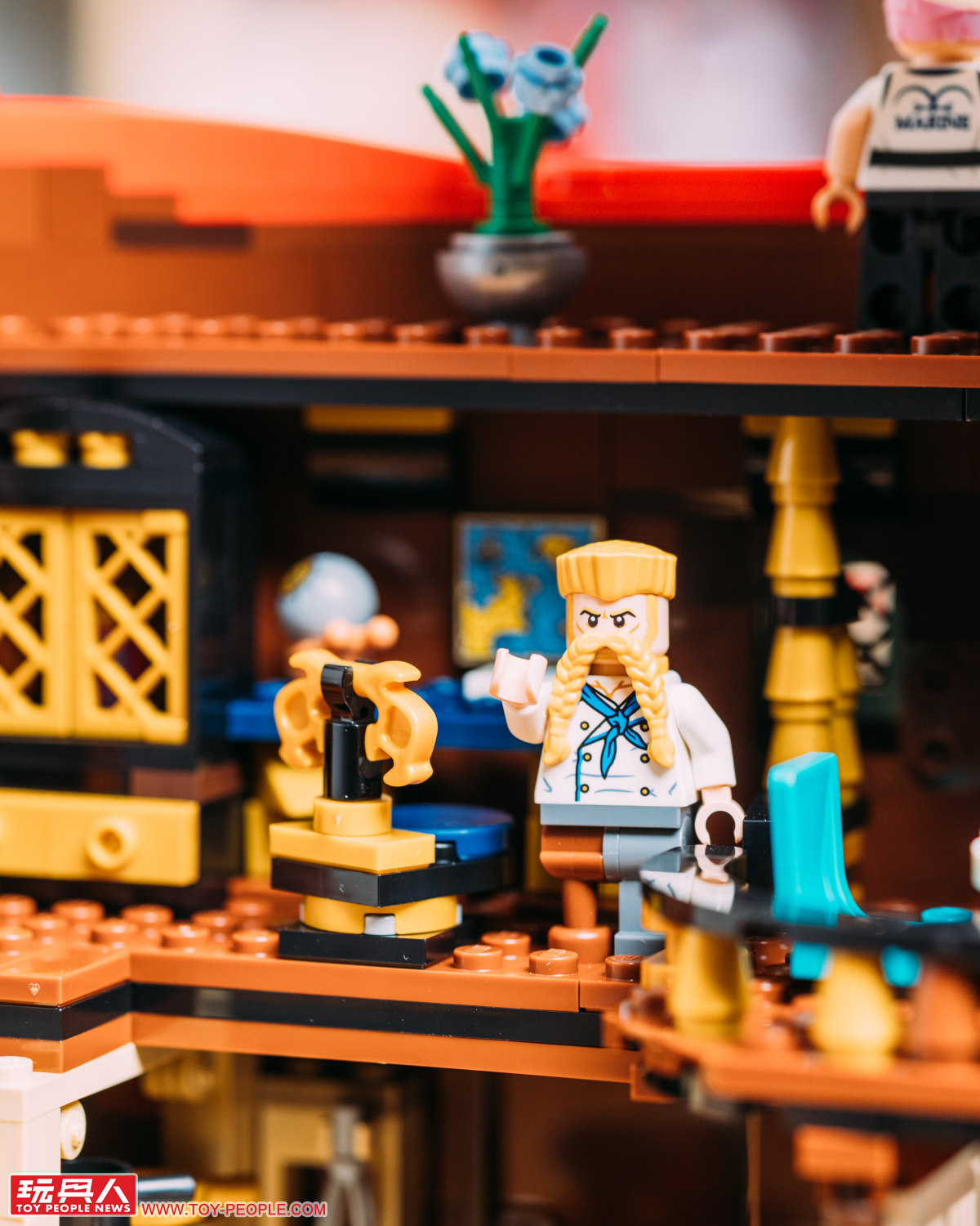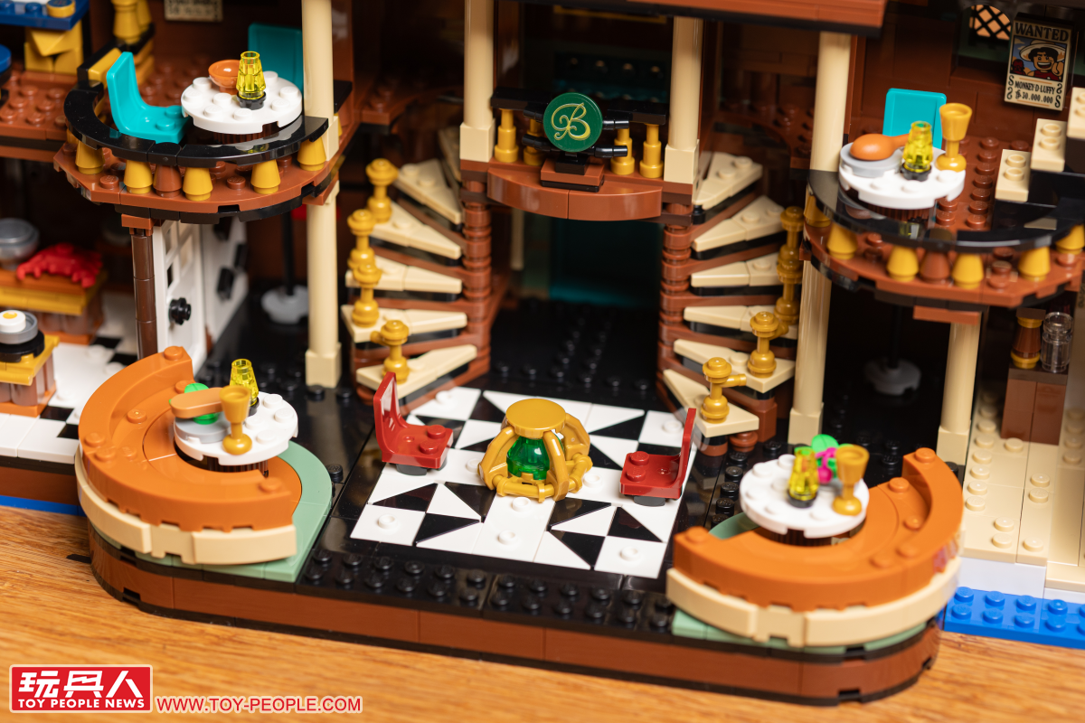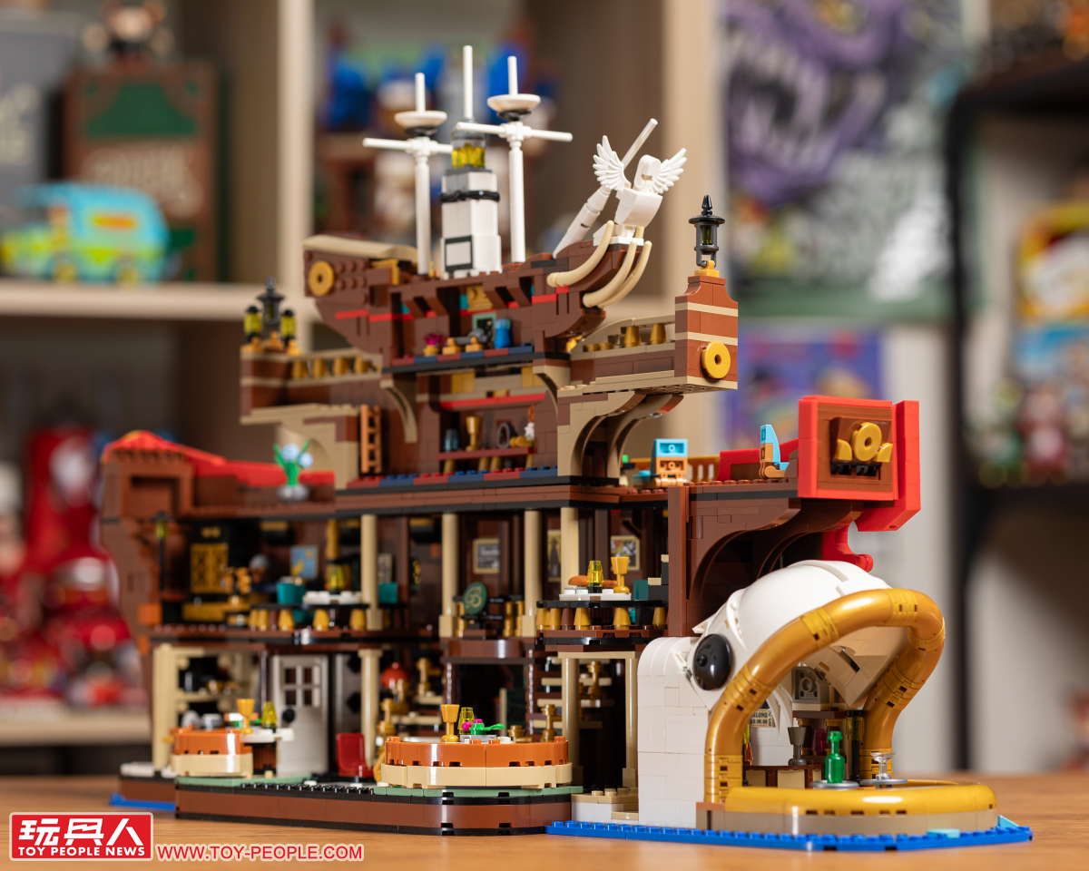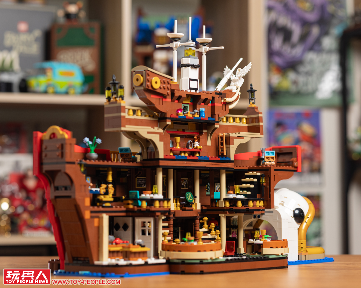 在首波的《航海王》LEGO 商品中,屬於零件數最多、體積也最大的海上餐廳,組完之後果然是十分壯觀。以小編個人的遊玩體驗來說,不僅在外觀上得到了許多刺激與靈感(尤其是魚頭的堆砌),同時呈現出三層樓的開放式內裝構造也非常精彩,從旋轉樓梯、二樓的地板、戶外的用餐雅座等,加上位於甲板的戰鬥機關、可旋轉的多人座位、隱藏在廚房牆角的收納架、哲普的辦公室,都值得細細品味。