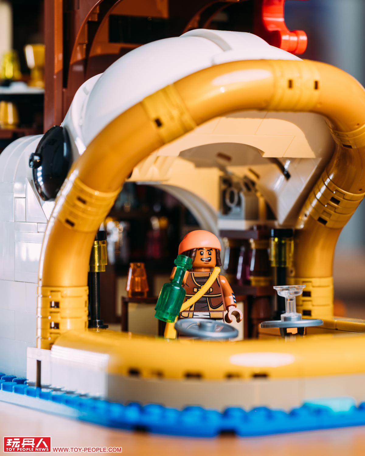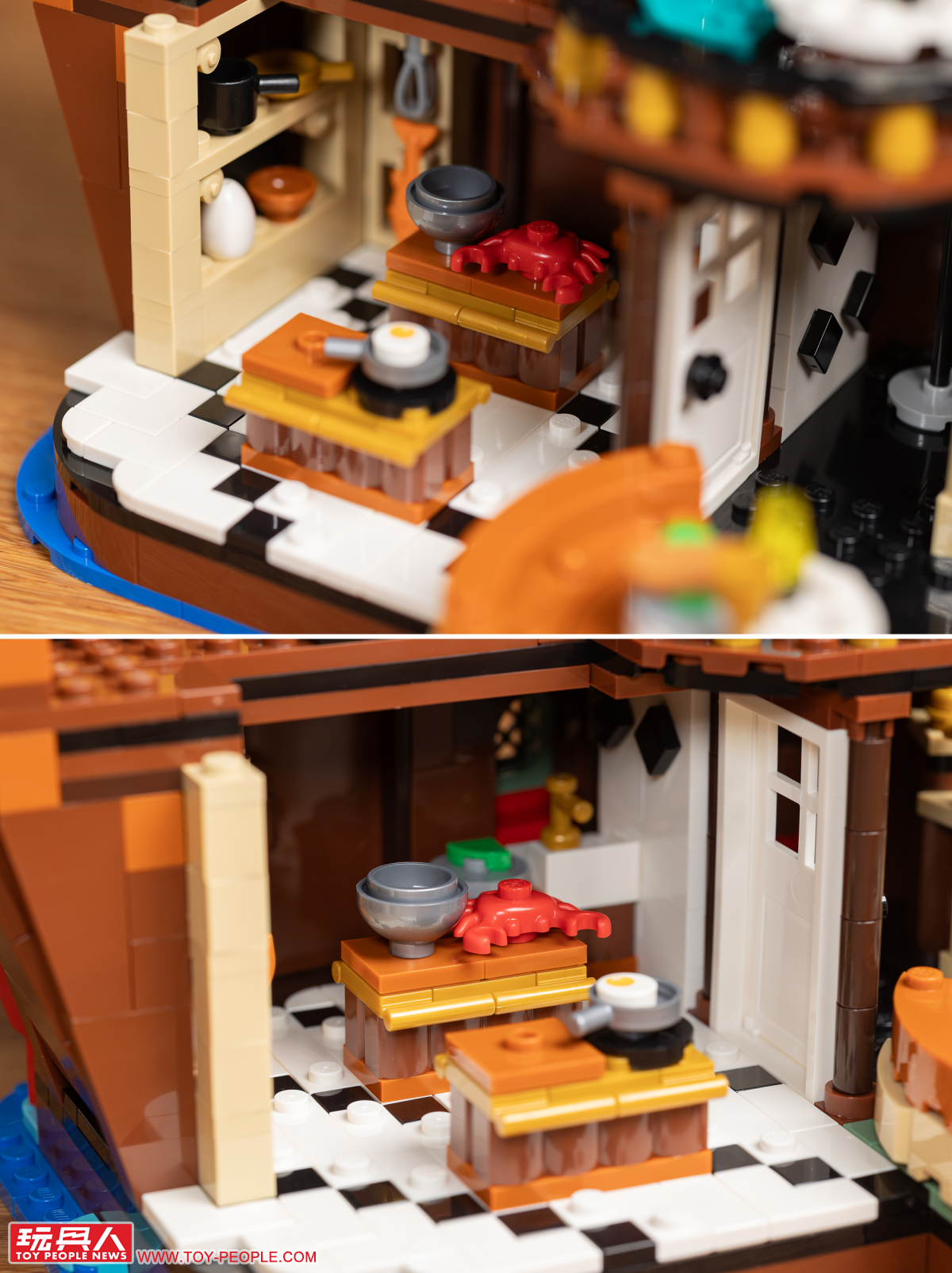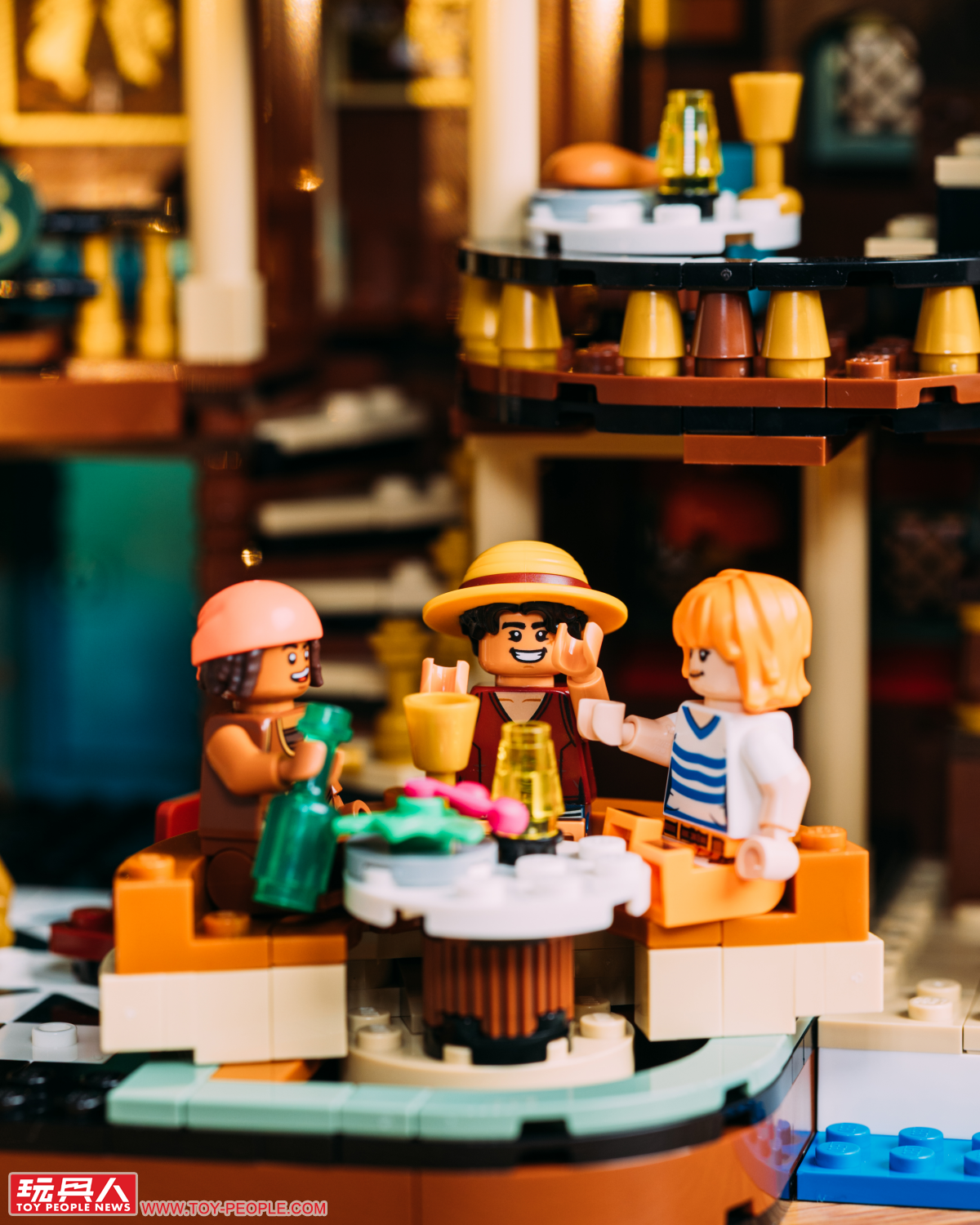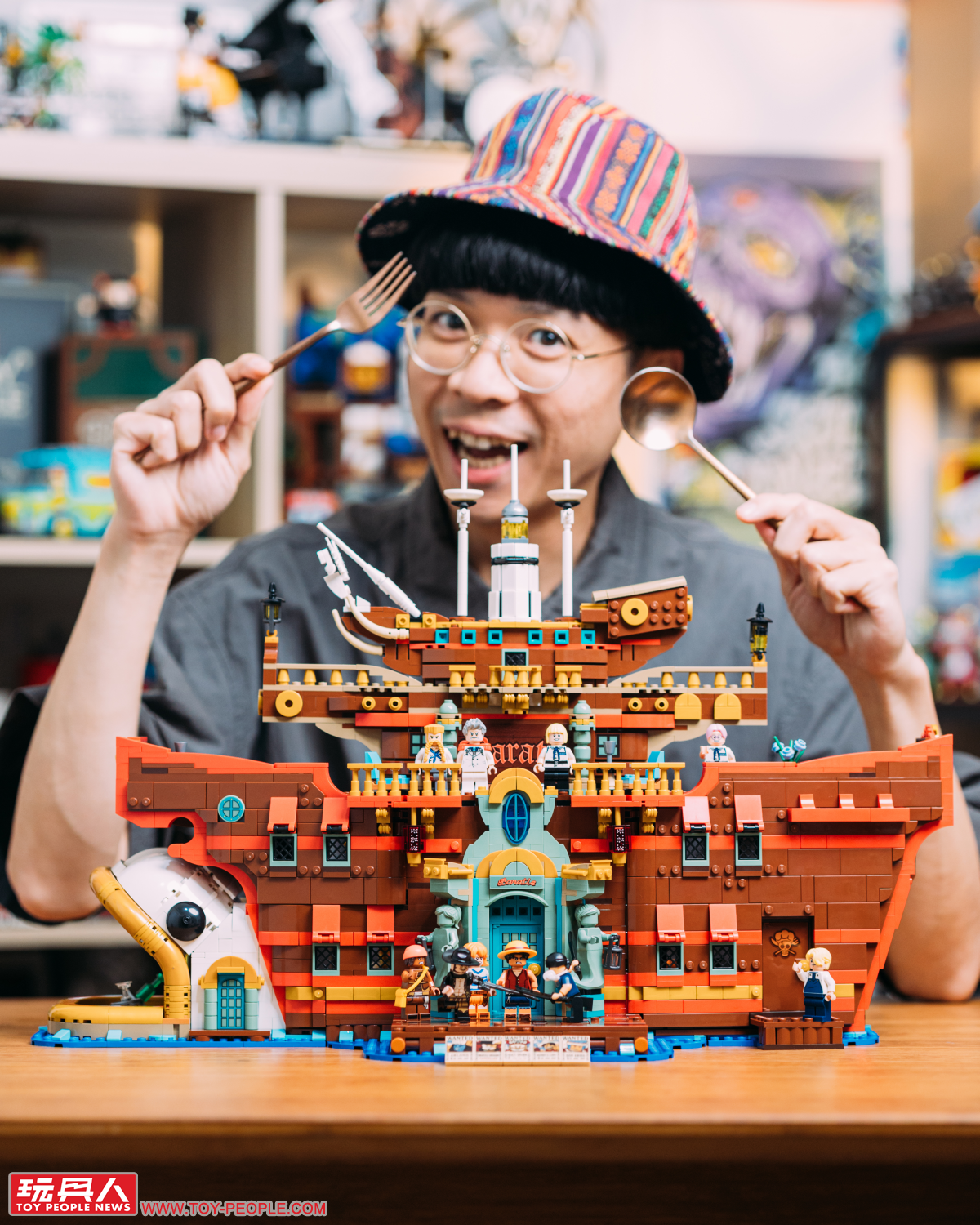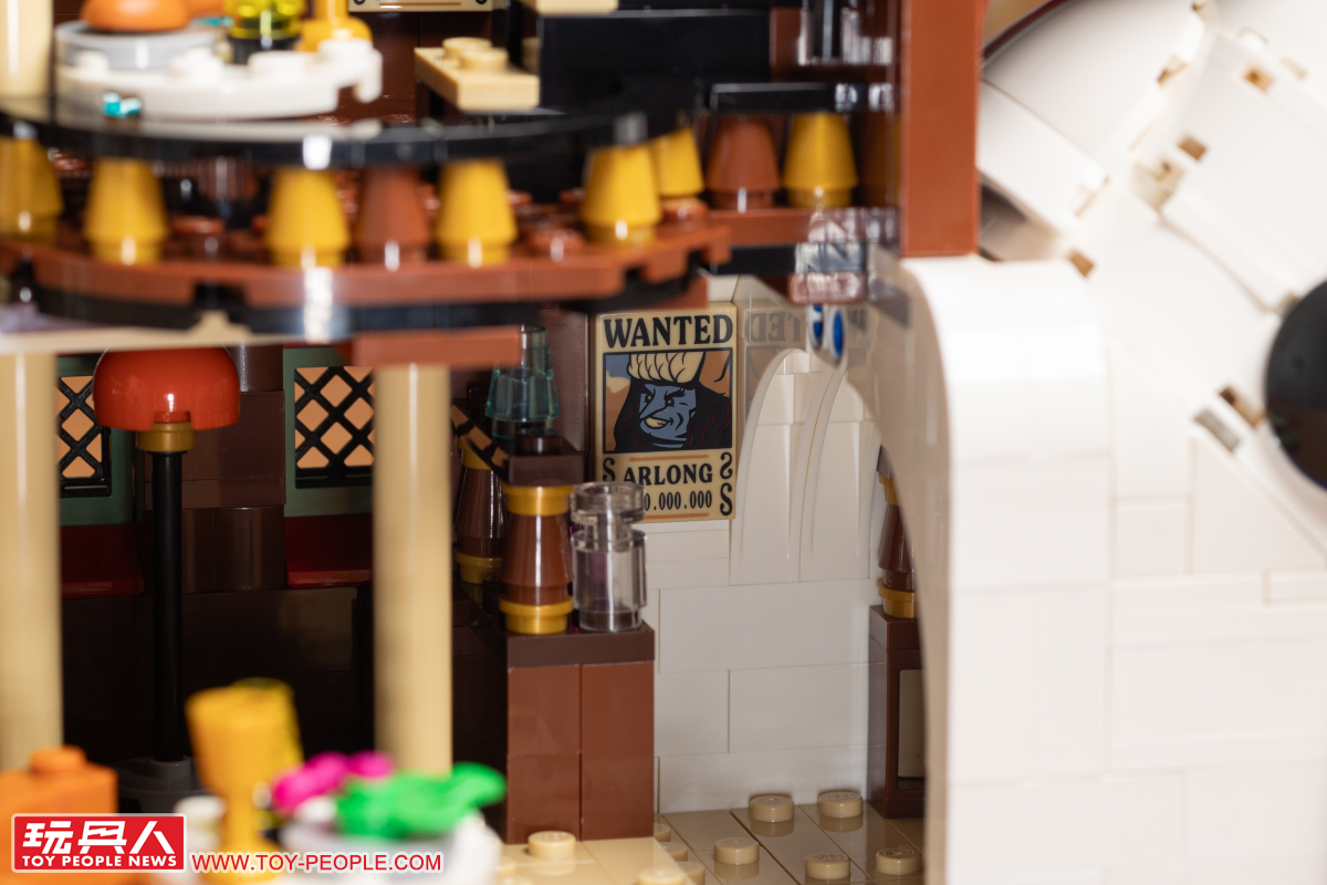 在首波的《航海王》LEGO 商品中,屬於零件數最多、體積也最大的海上餐廳,組完之後果然是十分壯觀。以小編個人的遊玩體驗來說,不僅在外觀上得到了許多刺激與靈感(尤其是魚頭的堆砌),同時呈現出三層樓的開放式內裝構造也非常精彩,從旋轉樓梯、二樓的地板、戶外的用餐雅座等,加上位於甲板的戰鬥機關、可旋轉的多人座位、隱藏在廚房牆角的收納架、哲普的辦公室,都值得細細品味。