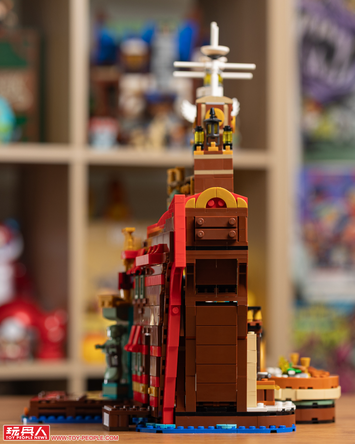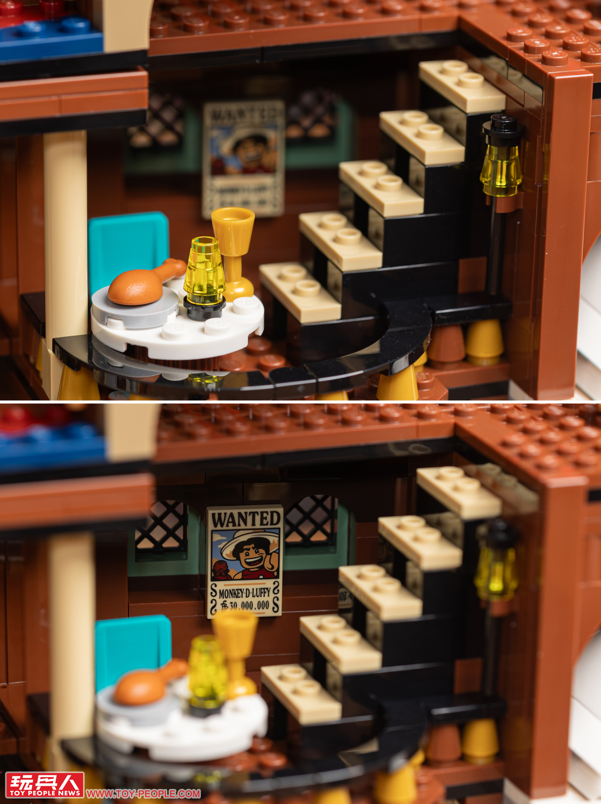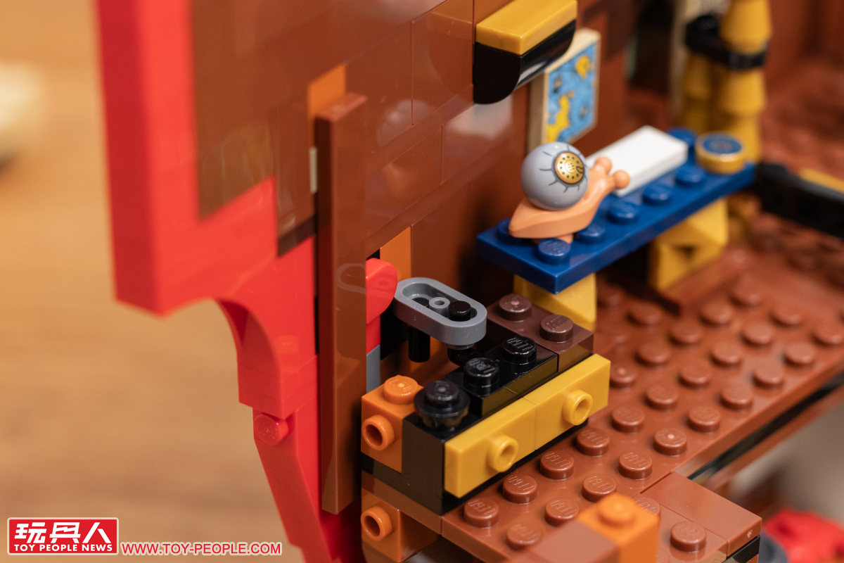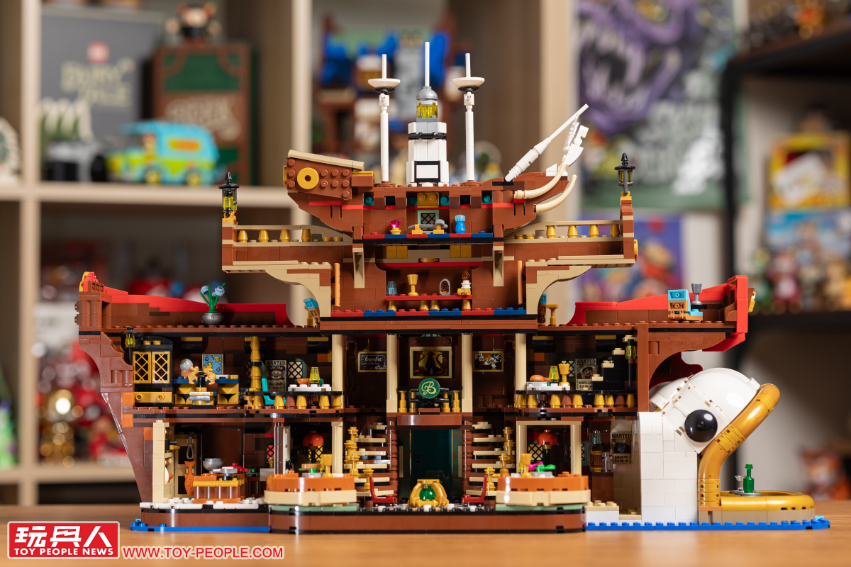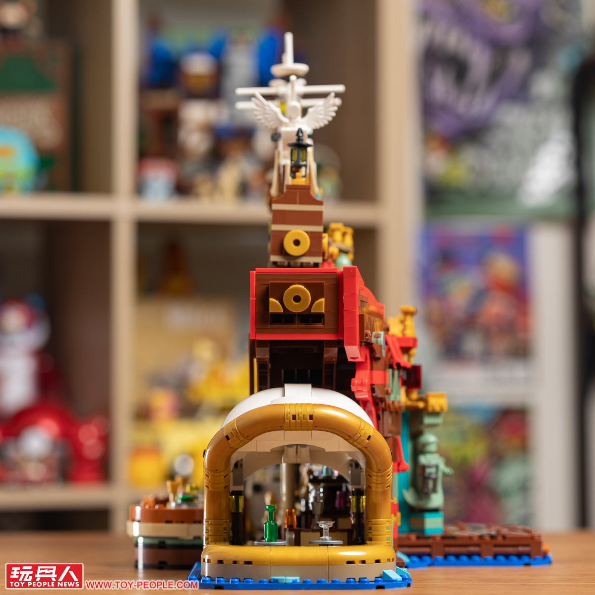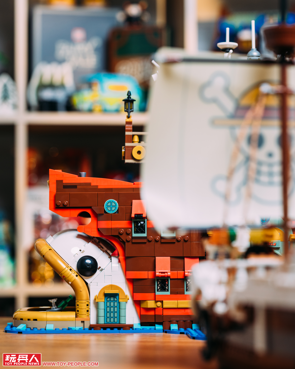 在首波的《航海王》LEGO 商品中,屬於零件數最多、體積也最大的海上餐廳,組完之後果然是十分壯觀。以小編個人的遊玩體驗來說,不僅在外觀上得到了許多刺激與靈感(尤其是魚頭的堆砌),同時呈現出三層樓的開放式內裝構造也非常精彩,從旋轉樓梯、二樓的地板、戶外的用餐雅座等,加上位於甲板的戰鬥機關、可旋轉的多人座位、隱藏在廚房牆角的收納架、哲普的辦公室,都值得細細品味。