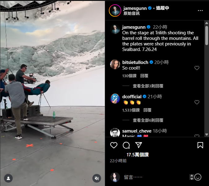 影片中可見,大衛·科倫斯韋(David Corenswet)穿著戲服、被固定在攝影棚的特殊裝置上,並由工作人員手動旋轉,模擬飛行翻轉的動作。現場搭配四周巨型 LED 螢幕,播放背景雪山影像,這些畫面皆在挪威斯瓦巴群島實地拍攝,並非電腦合成。岡恩強調:「臉是真人、背景是真景,完全沒有使用 CG。」