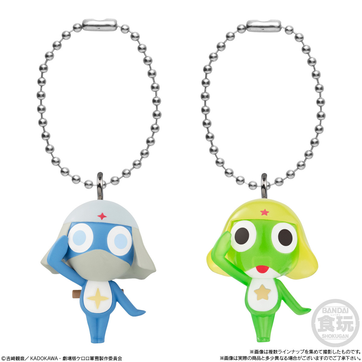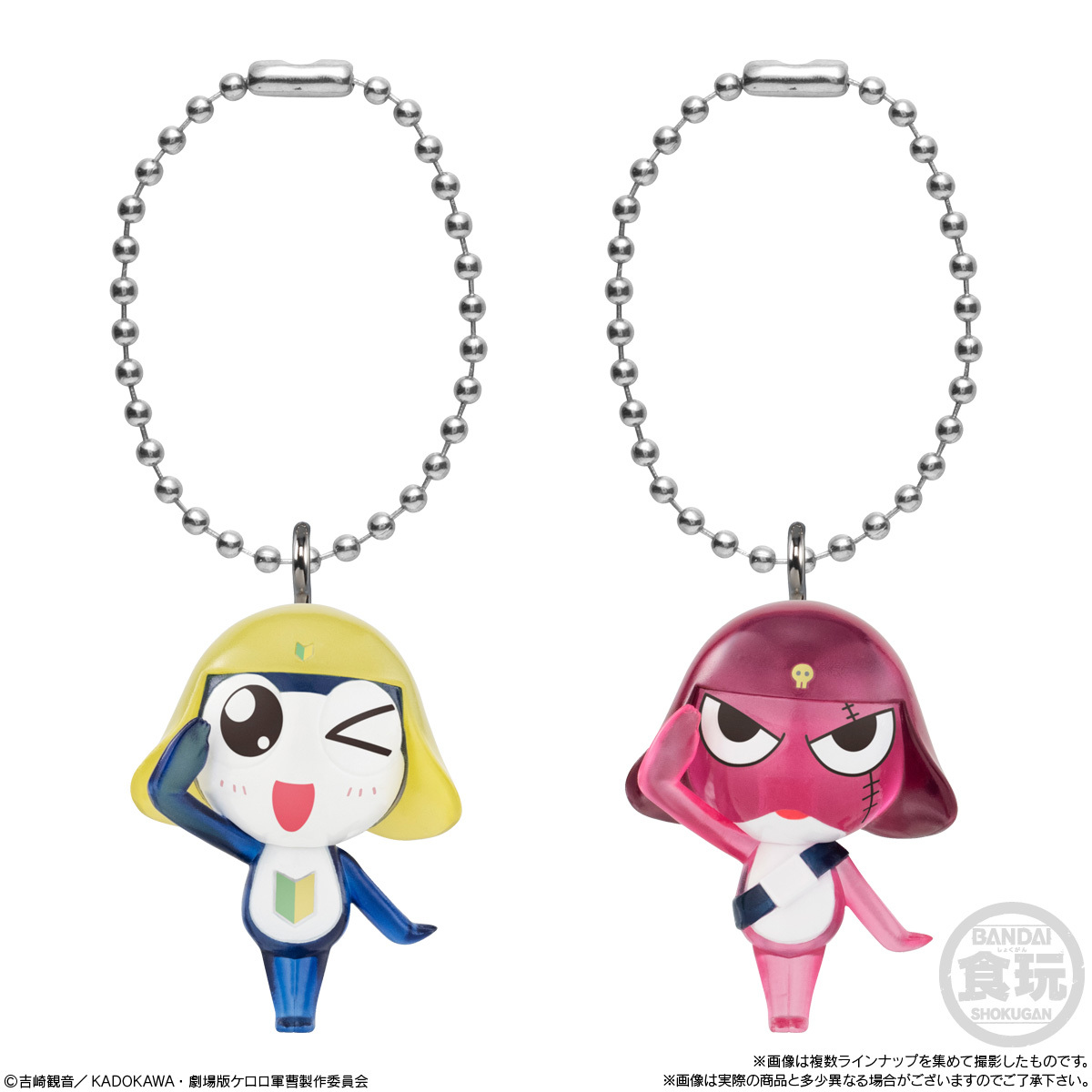本次的「Keroro 軍曹 角色吊飾&軟糖是也!」會隨麝香葡萄口味的 Keroro 造型軟糖附贈一款角色吊飾,收錄 Keroro 小隊的五位成員—— Keroro 軍曹、Tamama 二等兵、Giroro 伍長、Kururu 曹長以及 Dororo 兵長,每款都有一般及彩透版本兩種,共十種款式,並皆附有球鏈,不論是作為收藏擺設還是掛在背包上當吊飾都超級可愛!