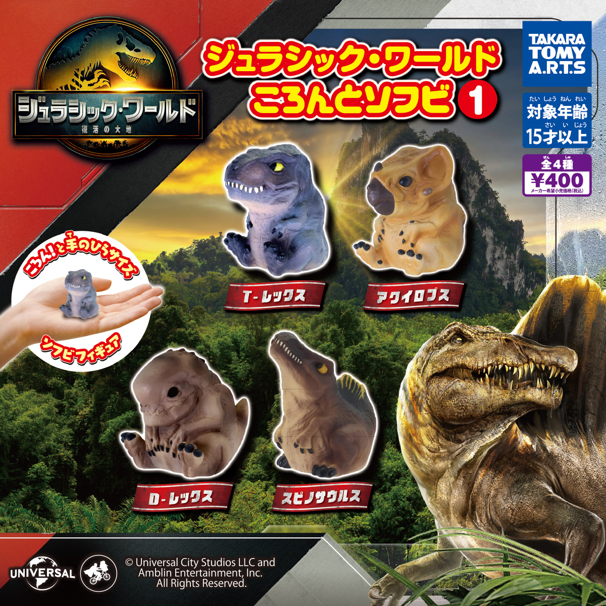 日本 TAKARA TOMY 公司旗下玩具品牌 T-ARTS 日前公開的恐龍轉蛋玩具「侏羅紀世界 圓滾滾軟膠1」(暫譯,ジュラシック・ワールド ころんとソフビ1)現已於日本展開販售!建議售價為每轉 400 日幣,一共有四種款式可以收集。