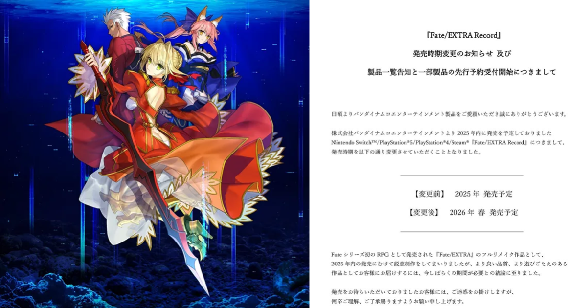 不過今日 ( 7/22 ) 傳來噩耗,萬代南夢宮娛樂宣布,原訂 2025 年內發售的《Fate/EXTRA Record》將延後至 2026 年春季推出,平台包括 Nintendo Switch、PS5、PS4 和 Steam。雖然遊戲要再多等一陣子,不過官網也同步公開了各版本商品資訊,包含超特裝版內容,並開放預購。