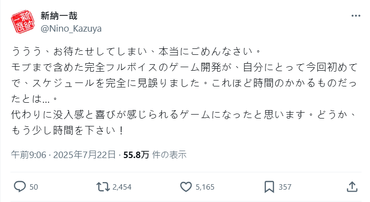 而本作負責人、TYPE-MOON studio BB 的新納一哉也在 X 親自致歉:「真的很抱歉讓大家久等了……這是我第一次製作全角色(連路人都算)都有語音的遊戲,沒想到開發時程抓得這麼錯誤……但我相信大家會感受到沉浸感與樂趣!拜託大家再給我一點時間!」