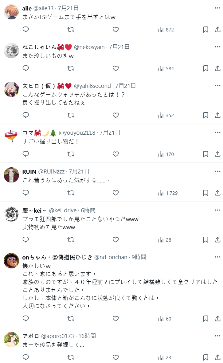 這款意外現身的「稀有收藏」立刻引發粉絲熱烈回應:「蛤?這什麼我完全沒看過欸……」、「帕特拉連LSI機種都開始收了喔」、「重點是還有盒裝!這真的太扯了w」、「希望妳哪天可以辦一場遊戲收藏展啊」等,大家都又驚喜又佩服,不僅會收藏廢人遊戲,連這種傳奇逸品都開始收了。