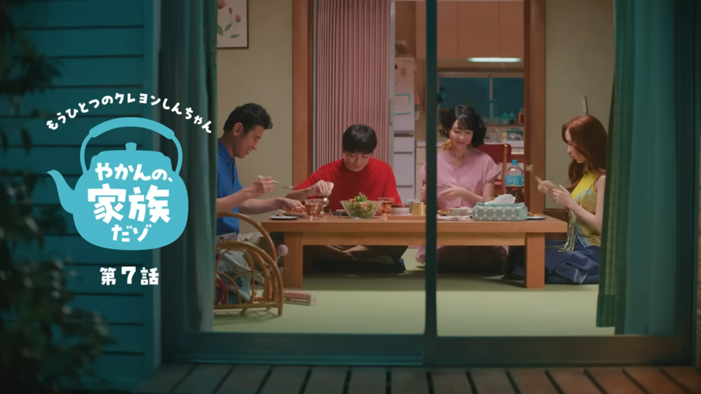 第七話講述小新跟小葵回到野原家跟父母團聚,四人圍坐在熟悉的客廳,一邊吃著媽媽特製的咖哩,一邊喝著麥茶,氣氛超級溫馨。不過好景不常,突然冷氣壞掉,原本廣志還帥氣的喊著這時就是男人拿出絕活的時候,結果想修還是修不好,整個家瞬間變成熱爆地獄!