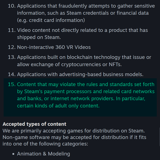 7 月 16 日,Steam 公開更新了平台的內容審核指引,明確指出將針對「特定類型的成人內容」進行限制。這項新規定一出,果然開始有大量遊戲遭到下架。隔天 17 日,又有更多成人向遊戲與 DLC 被從 Steam 平台上刪除。