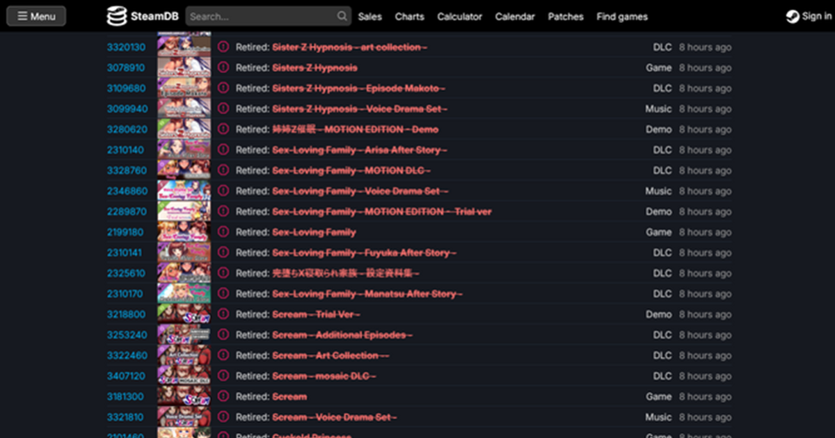 從第三方網站 SteamDB 查看遊戲的變更紀錄可以發現,現在已有一批又一批的成人遊戲被標記為「已退役(Retired)」或「已從商店移除(Remove from store)」。被刪除的對象,主要是來自日本、中國、韓國等亞洲地區開發的成人向遊戲。