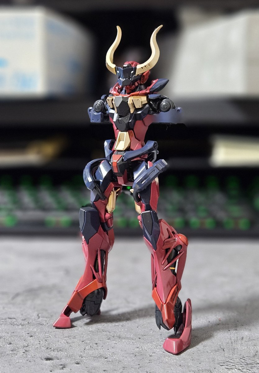 他這次改造的是「HG 1/144 GQuuuuuuX」,原本的配色是經典紅藍白的三色組合,不過經過スパイク的巧手,透過塗裝,以及各種鋼普拉組件的結合,變成了以暗紅紫為主色調、散發邪氣的惡魔風造型!