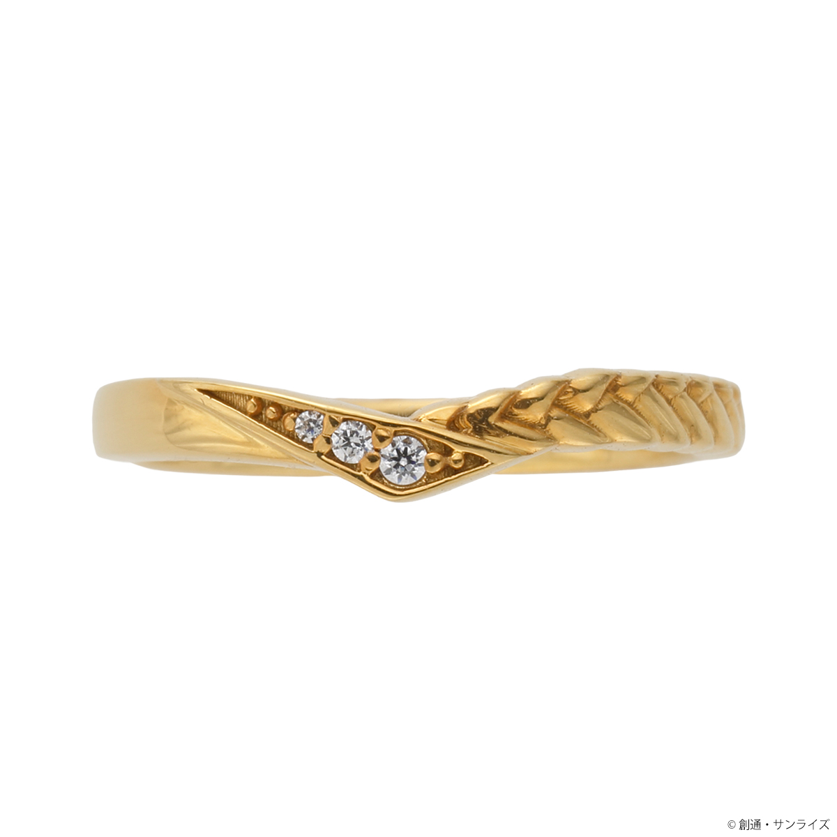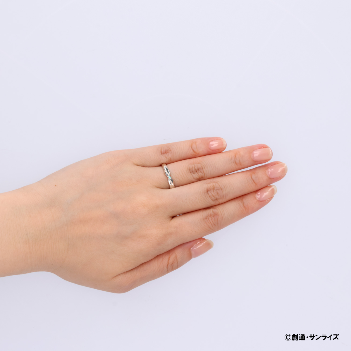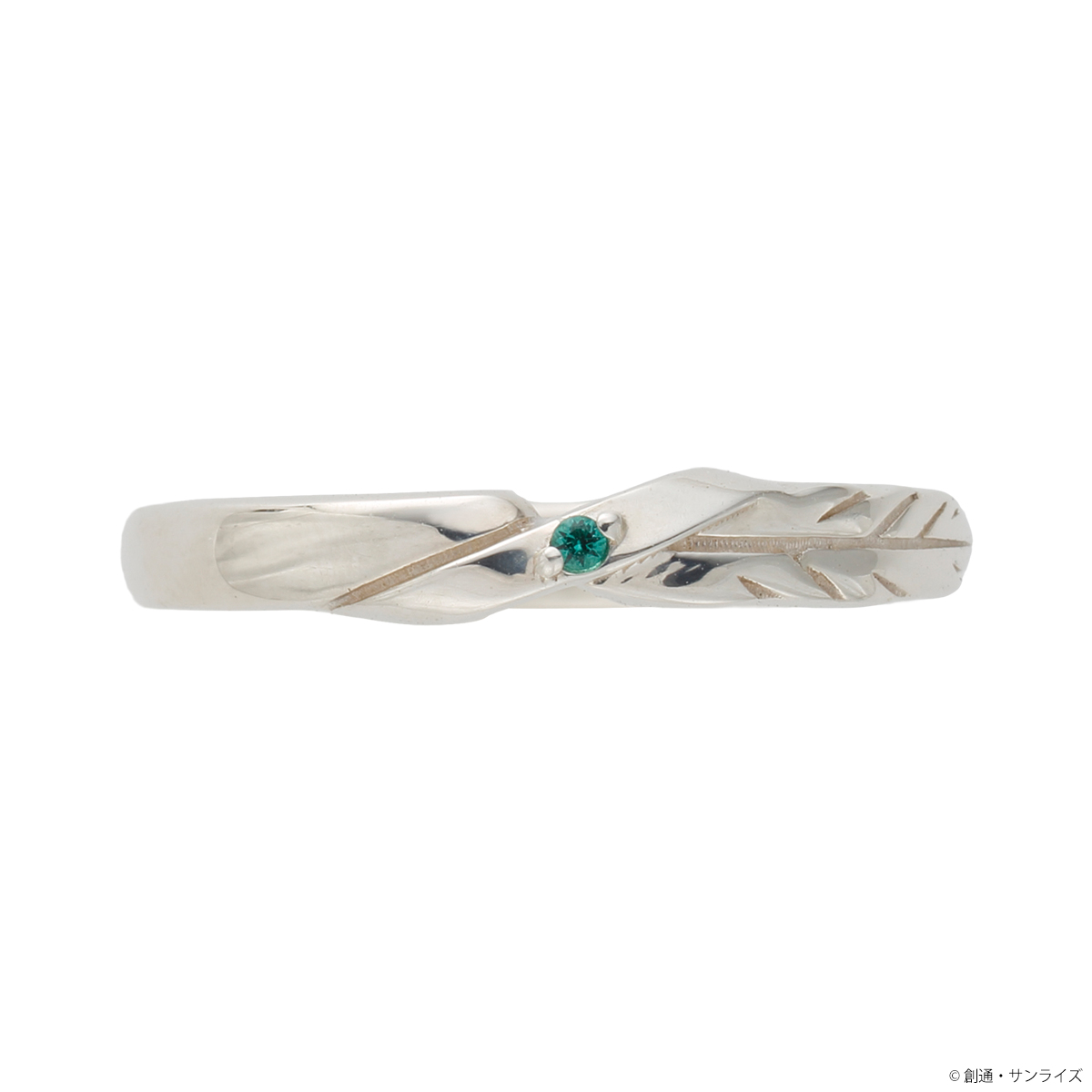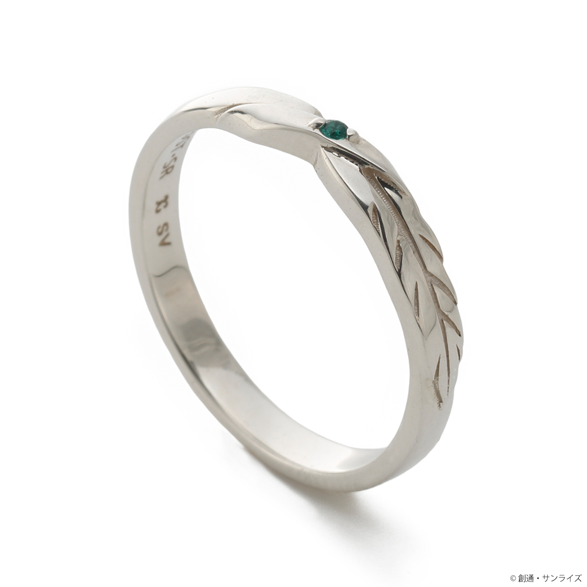 這款是為了慶祝鋼彈W 30週年而推出的紀念戒指。希洛款設計走簡潔有型風,戒身以立體的姿態建構,加上羽毛元素點綴,呼應他駕駛的「飛翼鋼彈零式特裝型」。中間鑲有一顆藍綠色寶石,代表他常穿的背心配色,內圈則刻有「HEERO YUY」的名字,簡單低調又不失韻味!