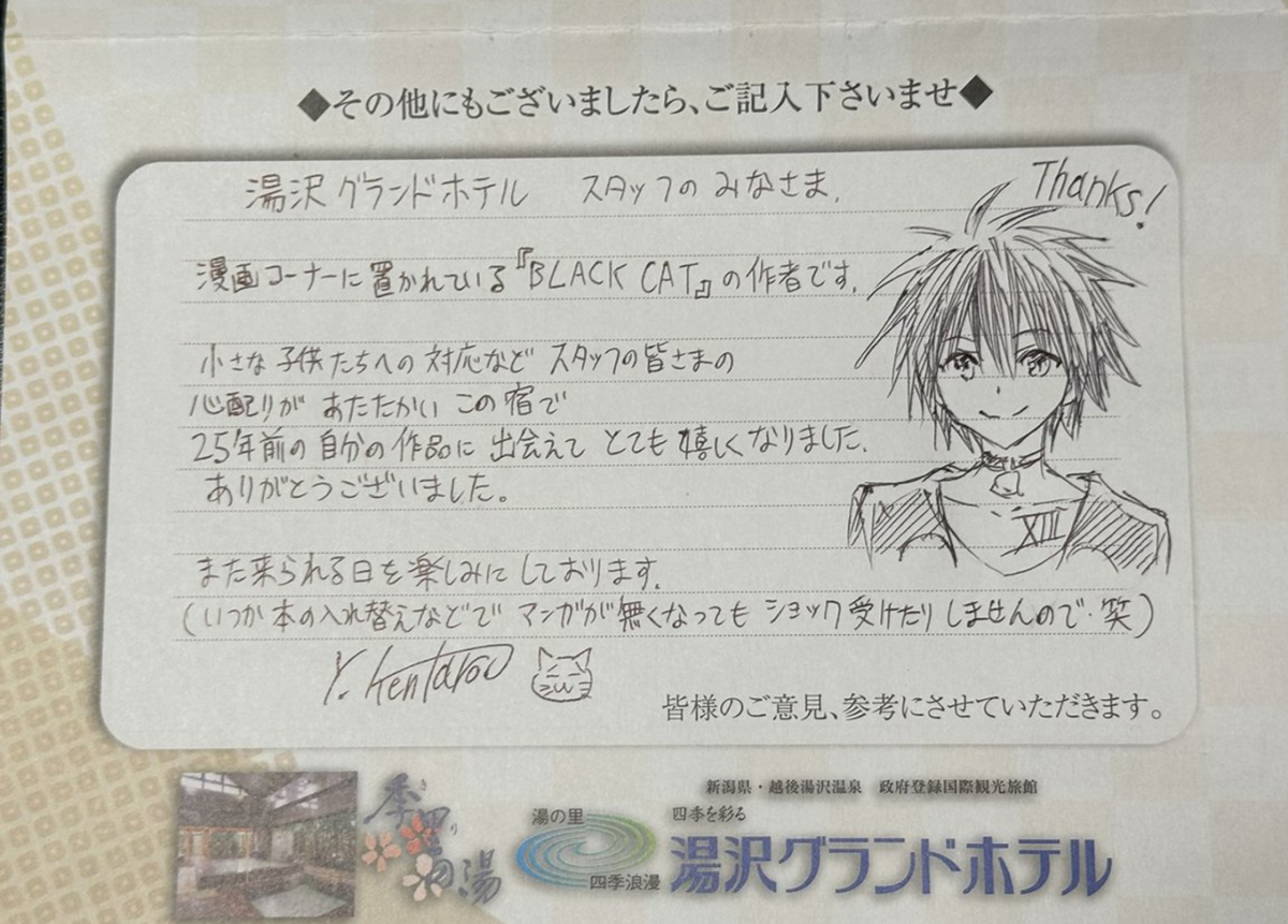 「自己就是《BLACK CAT》的作者,感謝飯店的貼心服務,像是送煙火給他的小孩等溫暖舉動,感謝將他的漫畫放在書架供人閱讀。」此外,老師還畫了一張主角「托雷·哈特涅特」的插圖,並在旁邊簽名留念!