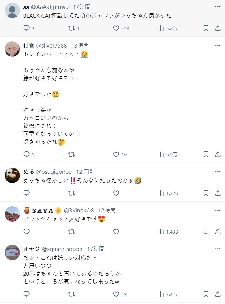 矢吹老師帶著家人去飯店住時,竟然意外在館內的書架上看到自己 25 年前創作的漫畫《BLACK CAT》整套放在那裡,對他來說可說一大驚喜!發文表示:「沒想到會用這種方式重逢 25 年前的作品,心裡真的超開心的。」