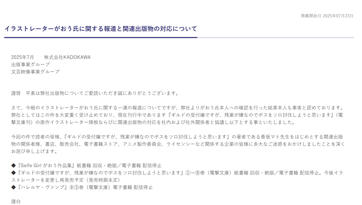 針對此事,KADOKAWA 表示,已就報導內容向本人進行確認,がおう本人也承認相關情節屬實,原本就確定會更換繪師取代他負責的工作,現在更決定採取相應措施公告。
