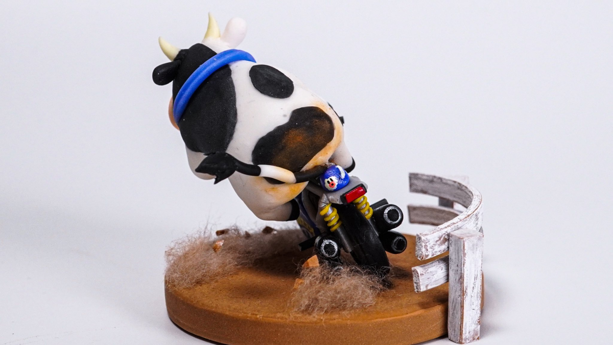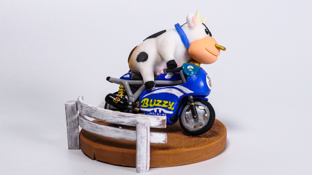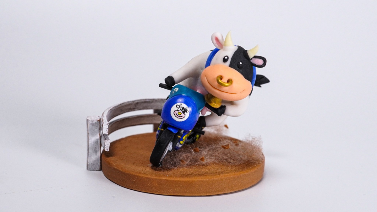 一名擅長製作黏土作品的推主「ネンドザイカーSNAIL」(@nendo_snail)也作了個乳牛的黏土偶,而且品質可不是一般的好。作者做出的是騎車中的乳牛,平台旁邊裝了圍欄,而本體乳牛則是擺著急轉彎的姿勢,且機車輪子高速旋轉捲起的塵土也有好好還原出來,明明是個靜止的黏土偶卻讓人感受到飆速的感覺。