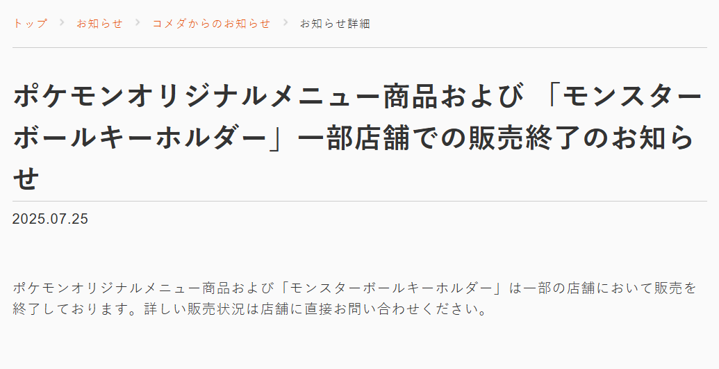 由於活動從昨日 ( 7/24 ) 才剛開始,今天官方就在網站和社群媒體上公告表示:「部分店鋪已結束販售」,並說明「寶可夢聯名餐點與『精靈球鑰匙圈』在部分門市已經銷售完畢」,提醒大家「詳細販售情況請洽各店鋪」。