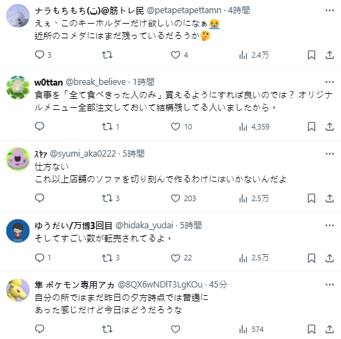 消息一出,X 上立刻炸鍋,網友紛紛留言表示:「才半天就完售也太誇張,真的有夠難過」、「可以考慮開放預購嗎?反正已經一堆人在高價轉賣了」、「撐不到一天是怎樣啦?」「拍賣網站上轉賣數量多到爆」「至少給只能週末來的人留一點吧www」「這太殘酷了啦……」各種困惑與哀怨的聲音不斷湧現。