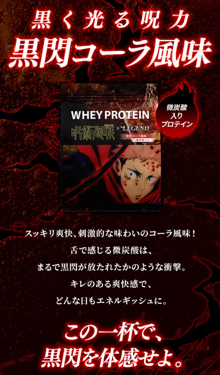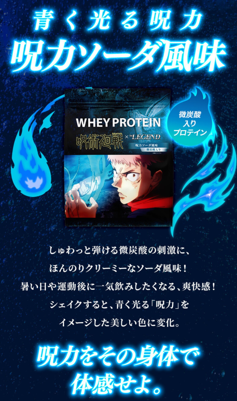 繼先前推出五條悟絕技「虛式・茈」聯名乳清蛋白粉後,再次與日本乳清蛋白販售品牌 be LEGEND 合作第二彈,這次以主角「虎杖悠仁」的咒力為靈感,推出全新的「微氣泡蛋白粉」,再次以創意挑戰粉絲的想像。