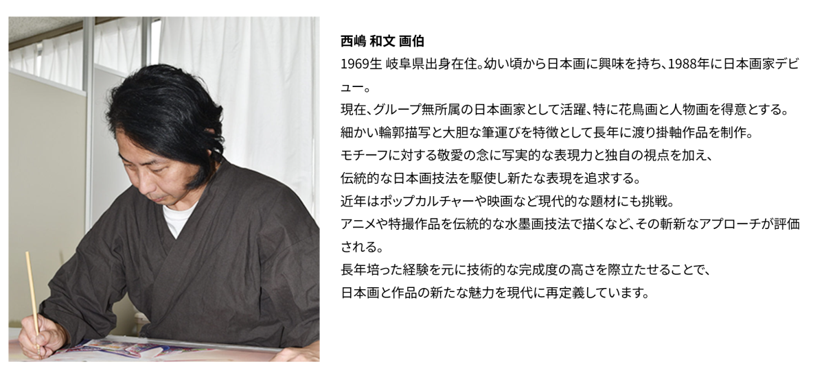 這次的經典場面,找來日本近年以「用水墨技法畫動畫角色」的嶄新風格廣受注目,致力於用傳統手法重新詮釋現代題材的傳統畫師西嶋和文繪製,透過細膩的手工技藝,把飛翼鋼彈零式EW 的機械美學完美結合進傳統畫中,並採用高級和紙,帶來截然不同的視覺享受,讓經典場面以全新樣貌重現。