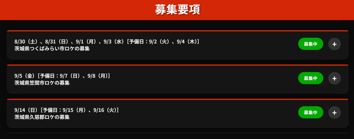目前募集確定將有三大場地,包含 : 茨城縣つくば未來市、笠間市與久慈郡,全部都在茨城縣拍攝,時間從八月底一路到九月中都有拍攝需求。