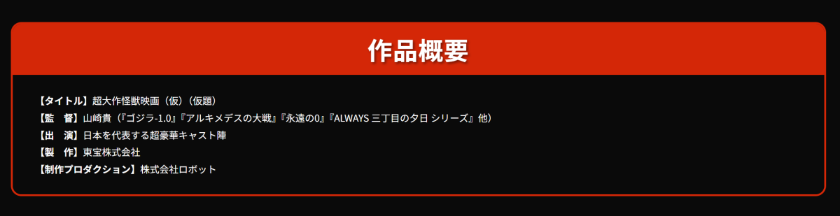 目前官方沒有公布作品標題,但是「超大作怪獸電影」看來不是哥佬也難吧 XD,不過既然已經募集臨演也在八月底九月間開拍,沒意外的話說不定過陣子就有詳細消息也說不定。