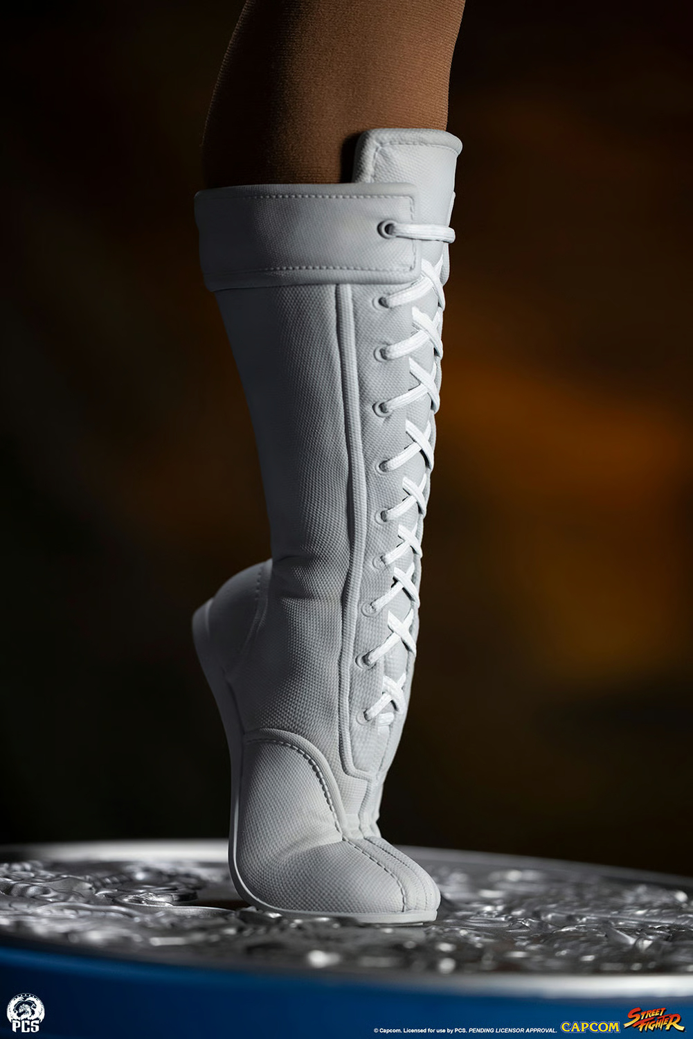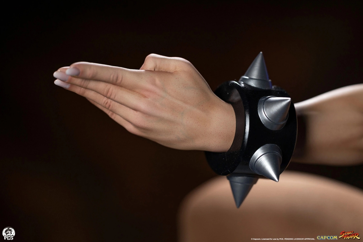 本作全高來到 36 吋(約 91.4 公分)、存在感相當驚人,春麗展現出從容不迫、單腳站立的備戰架勢,彷彿隨時可以施展強力踢技。整體造型是參照《快打旋風II》為題設計,以布料呈現那套鑲有金邊裝飾的藍色旗袍、白色雕花腰帶、褐色長襪、白色長靴,以及位於手腕的尖刺手環,當然,包子頭也考究還原啦!從各個角度都能感受到春麗作為格鬥家的結實肌肉線條以及身為女性的體態魅力。