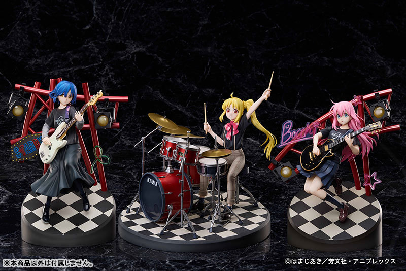 底座部分採用了 STARRY 標誌性的棋盤格造型,並細膩的雕刻還原爵士鼓的造型細節,塗裝再現金屬紅漆色的質感,精緻程度相當的令人驚艷!而這次的虹夏也可以與先前公開的小孤獨、涼和將在未來公開的喜多搭配擺設,購買全套四款角色還可以獲得連動特典一份,詳細資訊將於日後公開,相當令人期待!