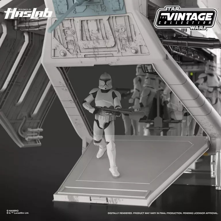 本次的步兵型低空突擊運輸艇由 HasLab 團隊與 Lucasfilm 合作打造,為先前推出版本的升級版,長 73 公分、寬 78.5 公分、高 26.9 公分的尺寸完美重現電影中的比例,將 3.75 吋的複製人士兵放在裡面,即便是完全站立的姿勢也不會碰到天花板!團隊細膩的還原了機身的造型,管線與面板、斑駁的機殼等各種細節都被精緻再現,還附有各種外殼的替換件,可以重現不同陣營中出現的步兵型低空突擊運輸艇造型!