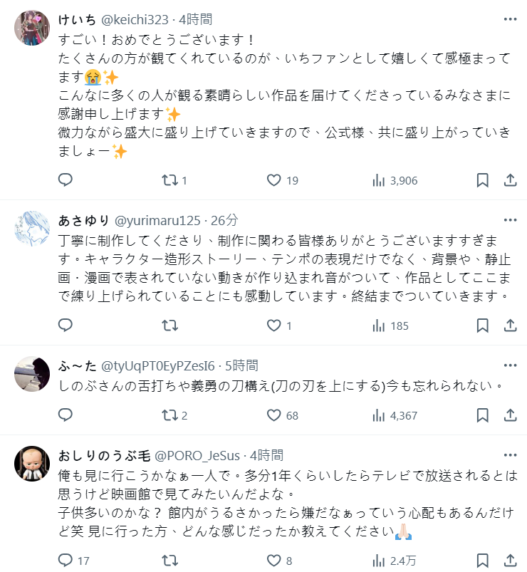 尤其這次《劇場版 鬼滅之刃 無限城篇 第一章 猗窩座再臨》在日本全國 452 間戲院上映,加上劇場版 ufotable 的精美製作,日本許多觀眾欣賞完後也都給予好評,不少人已經數刷展現狂熱。許多網友也直呼現在大家見面都問「你有看鬼滅之刃的電影嗎?」,根本就是全國運動等級。
