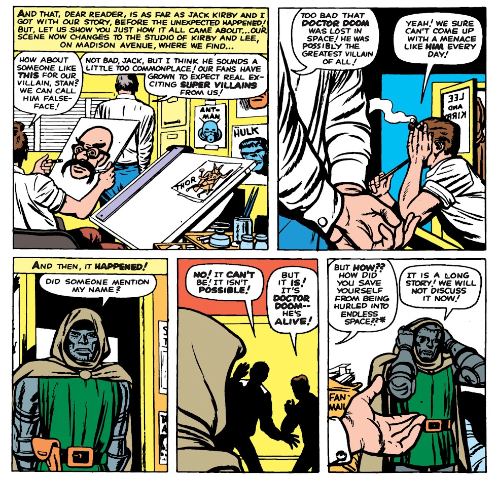 事實上,傑克·柯比與史丹·李於 1961 至 1971 年間合作逾百期《驚奇 4 超人》,經常在漫畫中打破第四面牆客串登場,例如 1962 年末日博士(Doctor Doom)造訪漫威漫畫辦公室的橋段,以及 1965 年他們在角色婚禮上被拒之門外的經典場面,至今仍讓漫迷津津樂道。