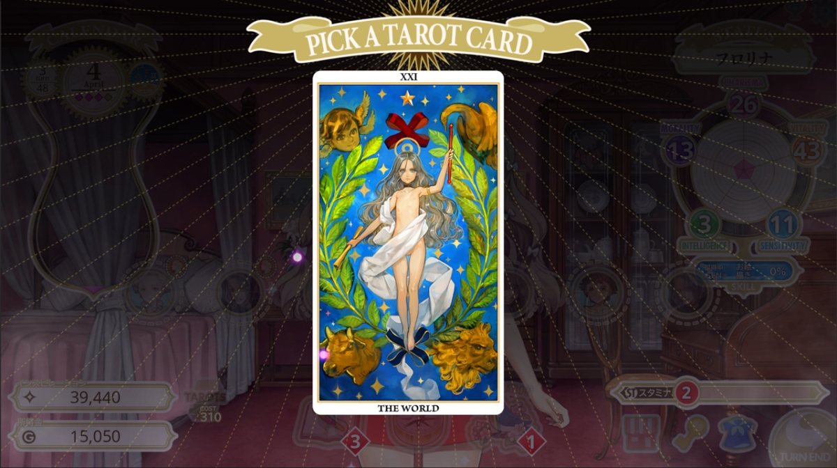 遊戲中較為特別的,就是可以透過累積的靈感值來取得塔羅牌,每張塔羅牌都有不同的效果,可以充分利用它們來推進遊戲,使遊戲朝著對你有利的方向發展。此外,22張塔羅牌與結局相關,每個結局都像徵著塔羅牌,有好結局,也有壞結局…