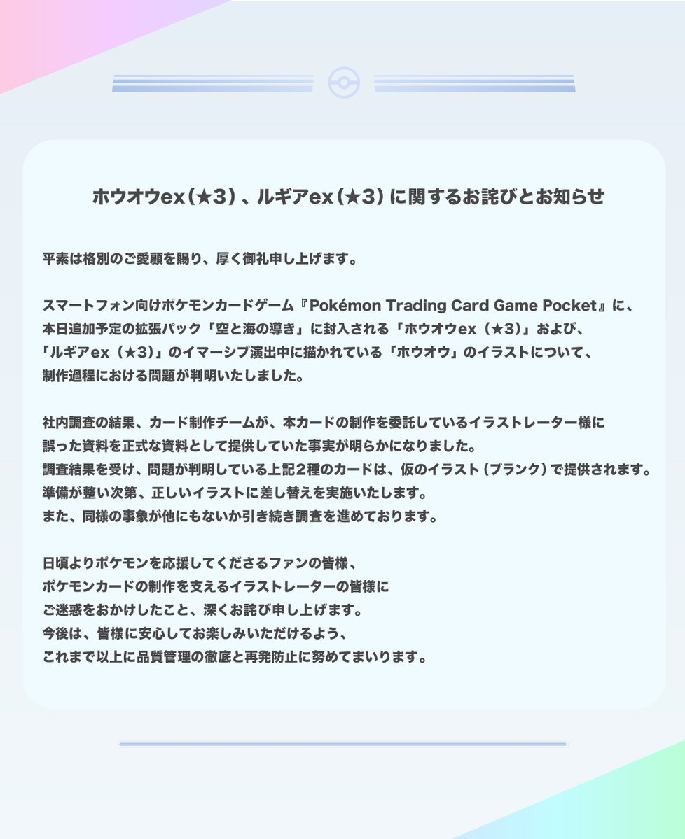 官方也在卡包尚未開抽的今日清晨,率先發布公告,指出「鳳王ex(★3)」與「洛奇亞ex(★3)」於製作過程中發現了問題。經內部調查後發現,負責卡片開發的團隊在把設計工作委託給插畫師時,誤把錯誤版本的參考資料當成正式資料提供出去,導致最終插畫內容出現錯誤。