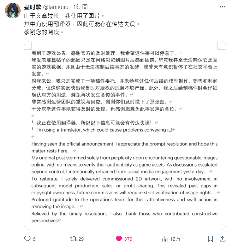 繪師昼时歌看到官方公告後,後續也發文表示,針對官方的即時處理也表達感謝,當初自己也只是完成稿件委託畫了那張圖,卻沒發現對方用途造成現在這樣的情況,當時自己對版權的理解也不夠謹慎。