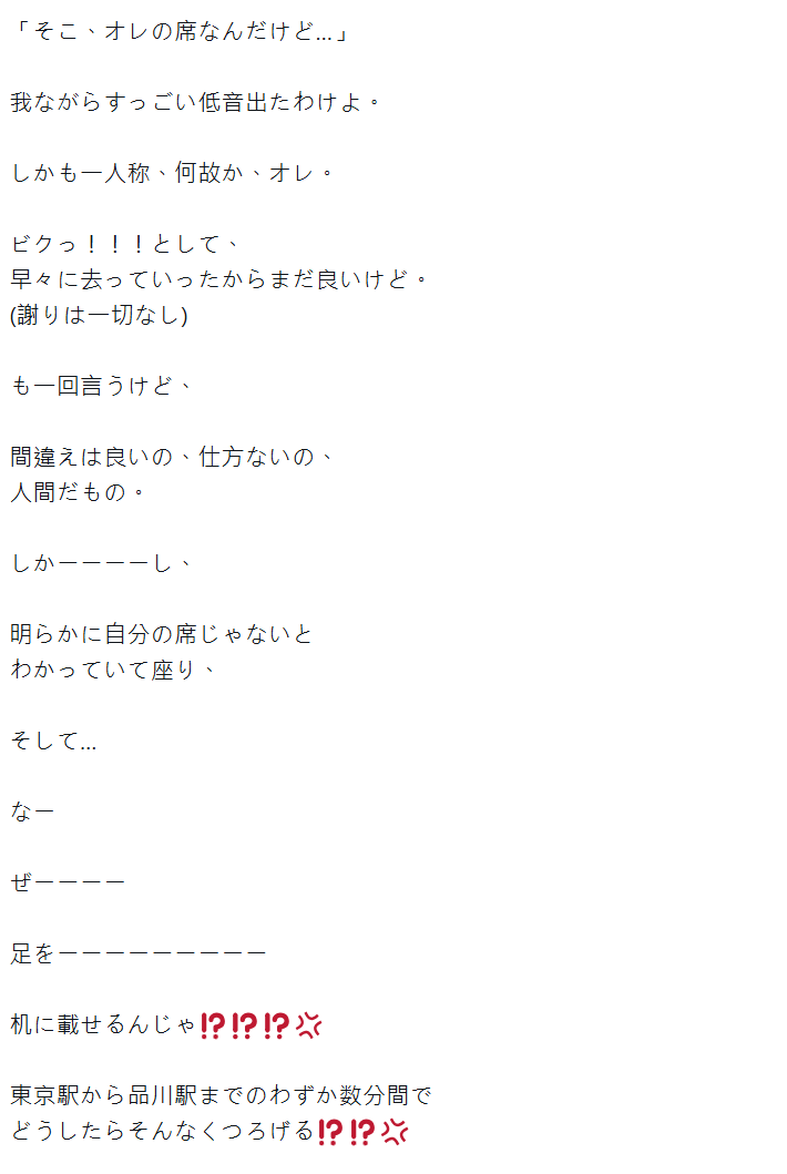 接著,朴璐美鼓起勇氣,用超有氣勢的低音對他說了一句:「那是我的位子。」(還用了「オレ」這種比較帥氣、強勢的一人稱),結果那男的被她氣場震住,立馬站起來逃走了,但全程一句道歉都沒說。