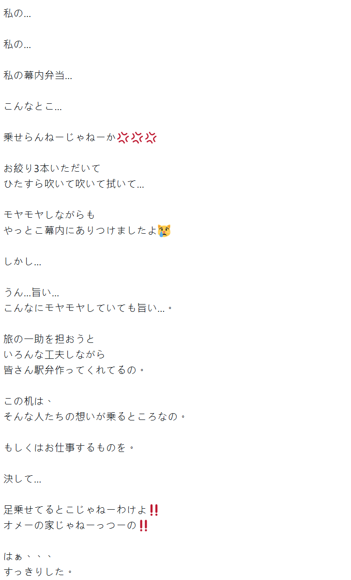 事後,她面對那張剛剛被人踩過的桌子,實在很難安心吃便當,只好跟乘務員多拿了三條濕紙巾狂擦狂清理,終於才好好坐下來吃飯。