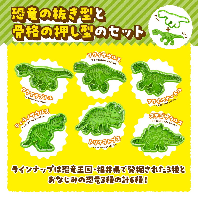 其實這也是福井縣立恐龍博物館成立 25 周年的合作企劃,收錄的餅乾模具組一共收錄六種恐龍造型,除了福井當地出土的福井龍(Fukui-saurus)、福井盜龍(Fukui-raptor)、福井獵龍(Fukui-venator),還有大家超熟悉的暴龍、三角龍、劍龍,每一隻都超有特色!