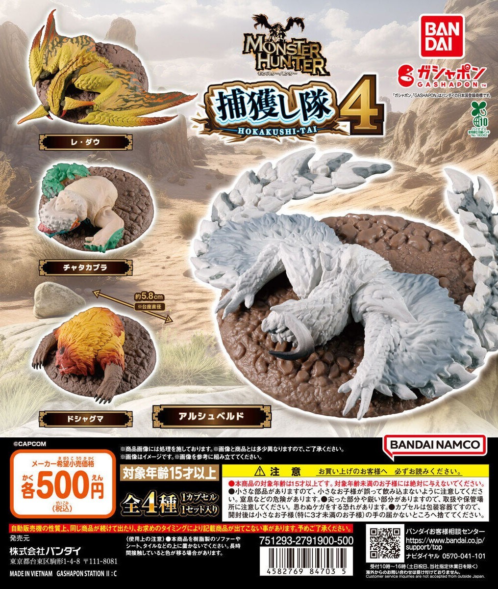 日本萬代轉蛋事業部 GASHAPON,繼好評的『捕獲隊』後,再度以人氣遊戲《魔物獵人》為主題,推出第四彈的『魔物獵人 捕獲隊4』,一共有 5 種款式,每轉參考售價為 500 日圓,預計將於 2025 年 08 月開轉。