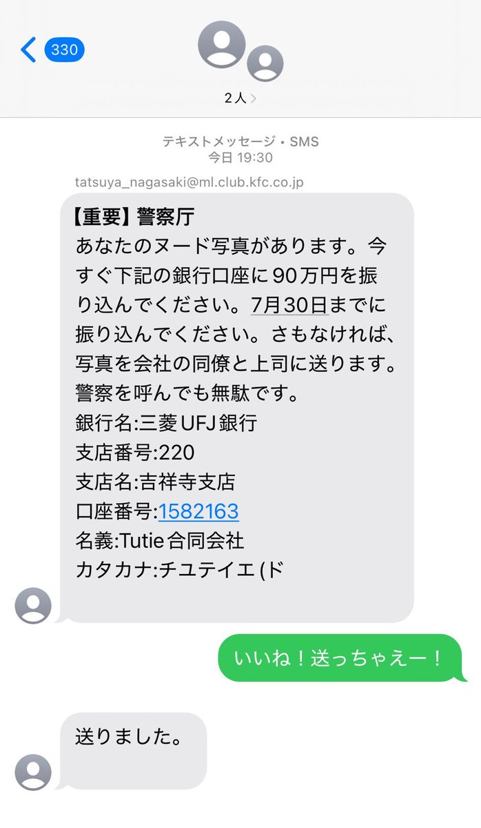 根據該名推主的截圖,這封信標註「重要 警察廳」的標題,表示已經有你的裸照,請立刻到下方所述的銀行匯款 90 萬日圓,要不然就馬上傳照片給你的公司同事跟上司。
