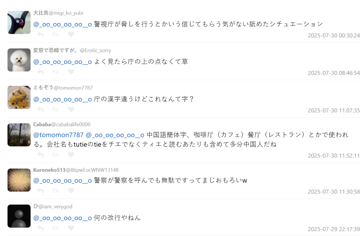 這篇貼文迅速在網路引爆討論,不僅笑翻眾多網友。其中信件中提到詐騙者偽裝為「警察廳」,但漢字中的「庁」少了一點,遭網友抓包是假字。更有網友發現該信使用簡體字,加上「Enter 鍵沒辦法直接傳送」的情況,判斷發信者可能來自中國,並非日本官方機構。這類詐騙常見於簡體圈,信件結構、語言風格與電郵發送方式都與中國常用通訊軟體(如WeChat)相似。