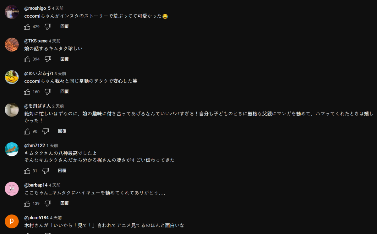 對於木村願意花時間陪女兒一起追動畫,許多網友在影片留言區感動表示:「可以跟爸爸一起追動漫真的太幸福了!」、「好羨慕女兒能跟木村拓哉一起在家看動畫啦!」、「工作那麼忙還願意配合女兒興趣,這才是真正的好爸爸!」。
