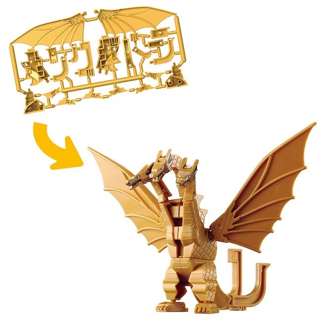 各零件組裝後就能完成全高約 9~10 公分的「哥吉拉」、「黑多拉」、「王者基多拉」可動模型,具備獨具風格的造型與色彩,包含哥吉拉的嘴/手掌/尾巴、黑多拉的手/腳、王者基多拉的三顆頭/翅膀/尾巴等多處都有可動設計。