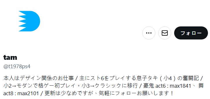 事實上這是タキ的老爸記錄自家小孩玩《快打旋風6》的奮戰帳號,他小二開始接觸格鬥遊戲,當時用的是現代操作模式,小三後轉成經典操作模式。他操作豪鬼時最高達成 Act6:1841 分,不知火舞目前則是 Act8:2101 分。