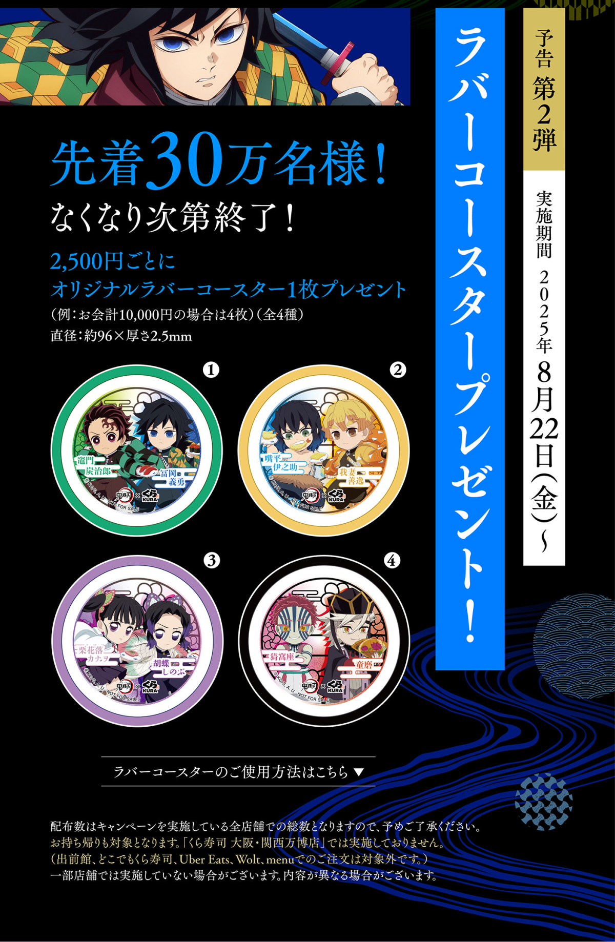 這次聯名餐點部分,這主打《鬼滅之刃》中的鬼殺隊四位人氣角色:炭治郎、冨岡義勇、蝴蝶忍、栗花落香奈乎,以他們為靈感設計出特色壽司與甜點,限時供應中!