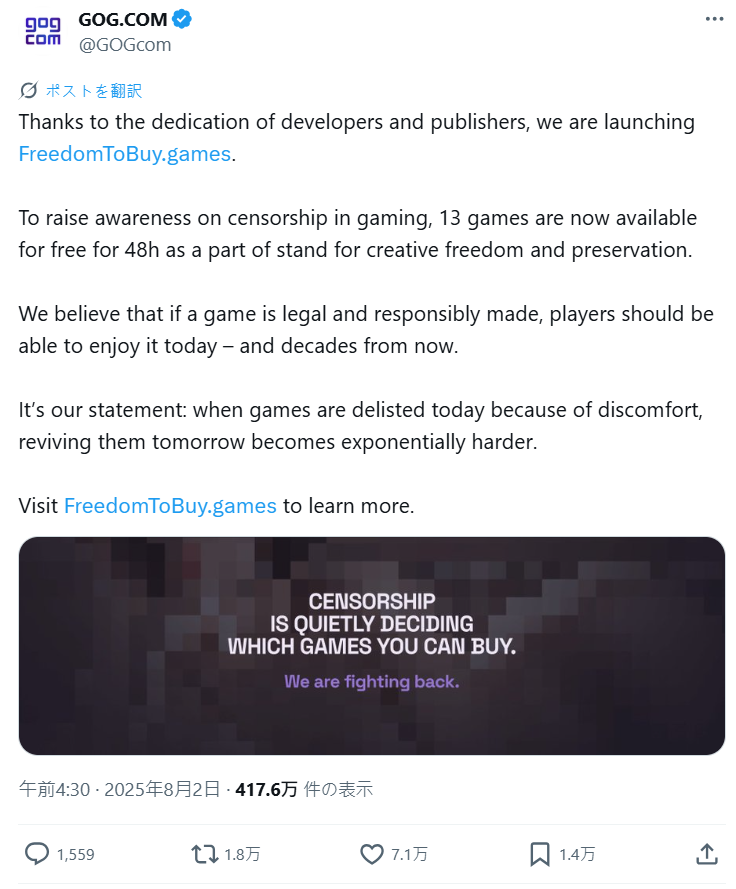 和其他遊戲平台不同,CD Projekt 旗下的 GOG 在 8 月 2 日發起「FreedomToBuy」活動,公開對抗表達審查。活動中免費贈送 13 款成人向遊戲給全球玩家,限時 48 小時內已有超過百萬人索取,也被視為針對這次風波的抗議。
