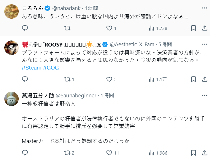 當然這次因為人權團體的呼籲,讓部分信用卡公司要求平台「限制特定內容」,網友們懷疑這是變相的內容審查,不少人認為這根本是信用卡公司在搞言論審查。當然日本玩家也相當不悅,對這個現況從過去 DLsite、Melonbook 等也都被信用卡公司限制,也是深受其害。